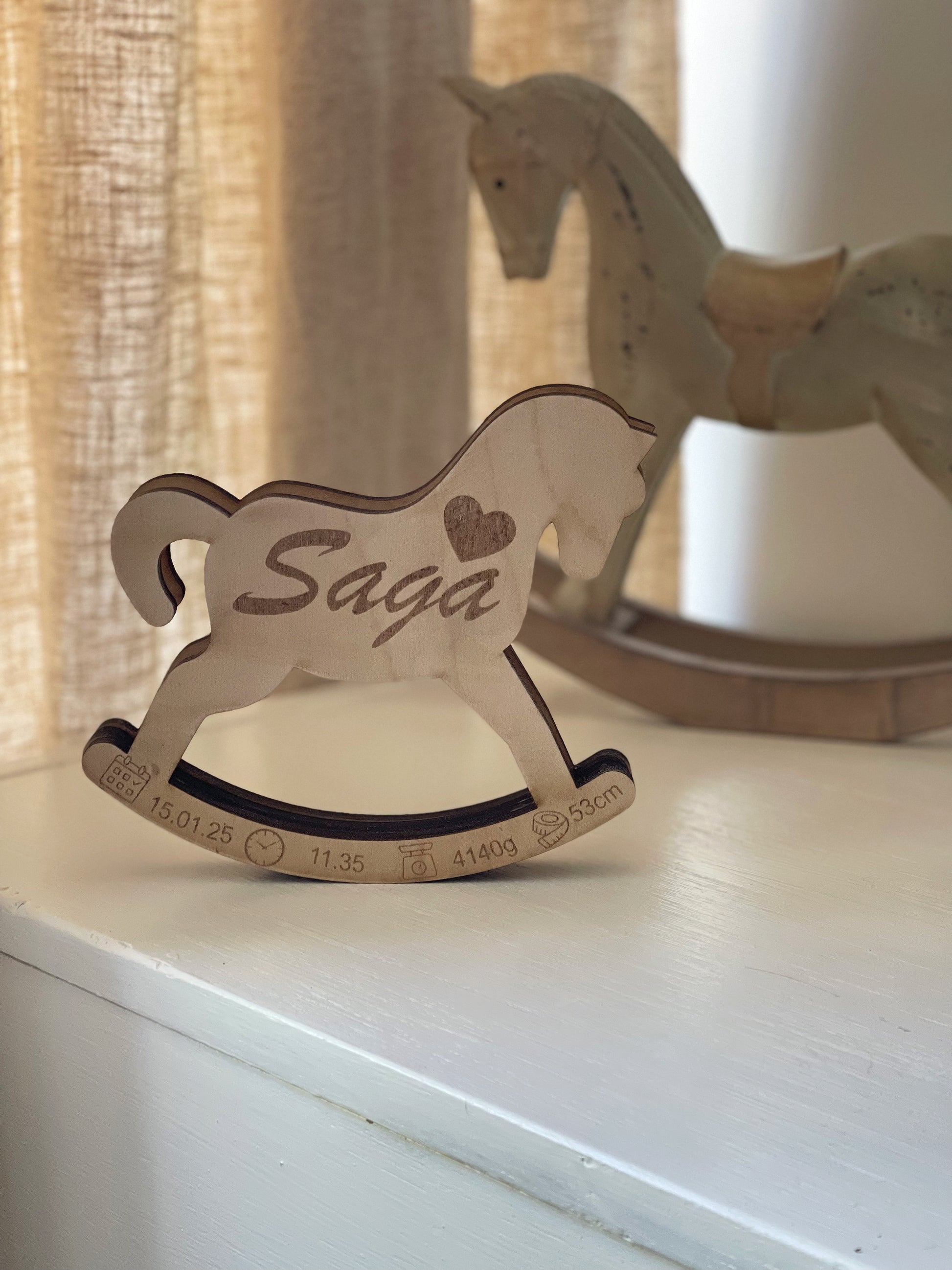 Giv en gave, der både vækker glæde nu og bliver et varigt minde. Denne smukke gyngehest er lavet i solid krydsfinertræ og kan graveres med barnets fødselsinformationer – navn, dato, tidspunkt, vægt og længde.
