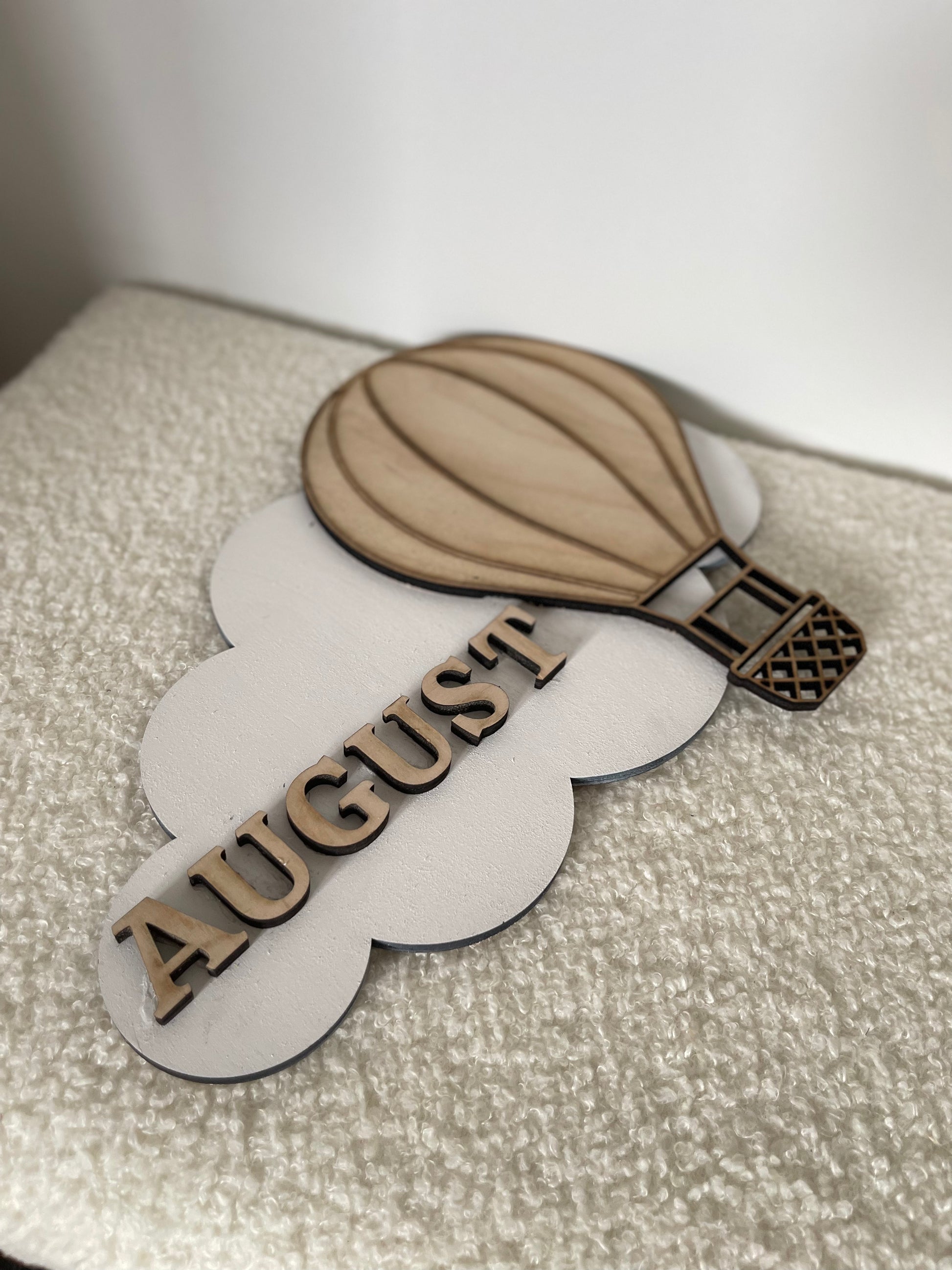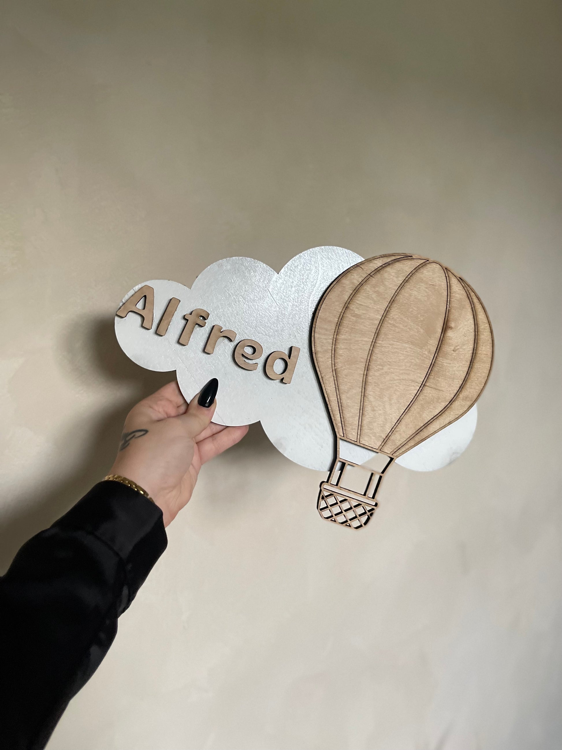 Tilføj et personligt touch til dit barns værelse med vores charmerende navneskilt i skyform, dekoreret med en sød luftballon. Skiltet er lavet af kvalitets krydsfinertræ, som sikrer både holdbarhed og et varmt, naturligt udseende.