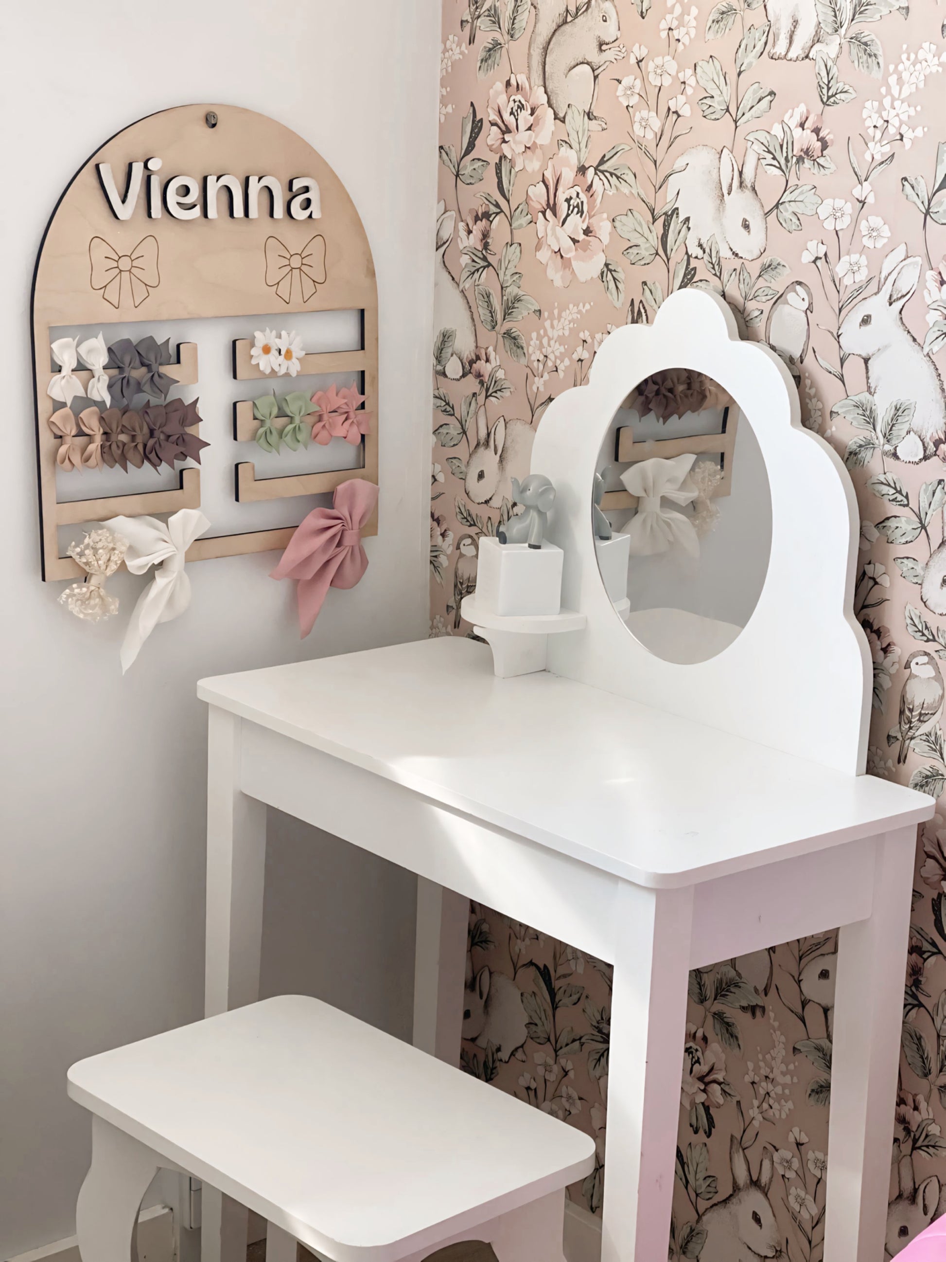 En sløjfeholder med navn er et praktisk og dekorativt produkt, der bruges til at organisere og præsentere sløjfer, bånd eller lignende. Den er lavet i krydsfiner som er lyst træ for at matche enhver indretning.